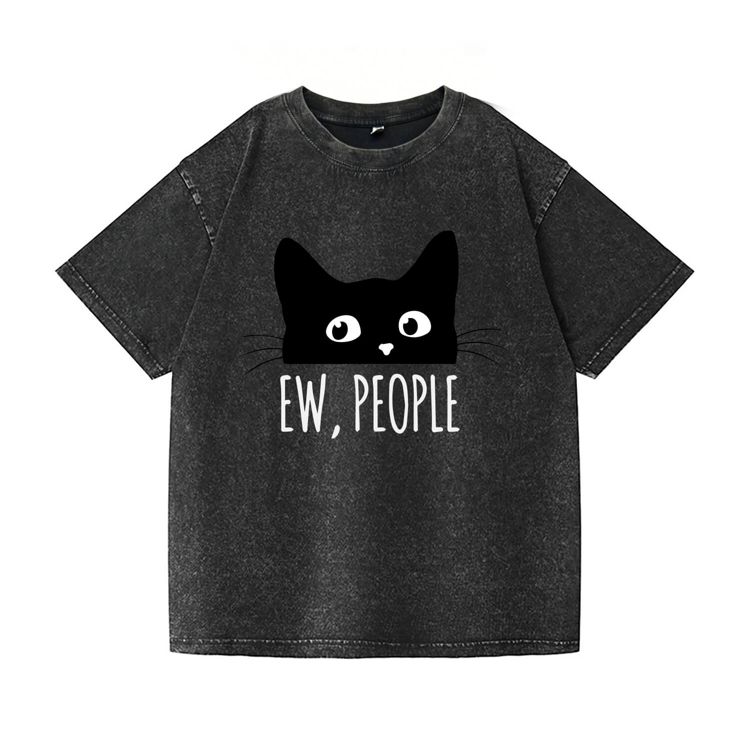 The vintage-faded black tee features a playful black cat peeking out with the iconic “EW, PEOPLE” text—perfect for cat lovers, introverts, and anyone who’s ever needed a silent “please don’t talk to me” sign.