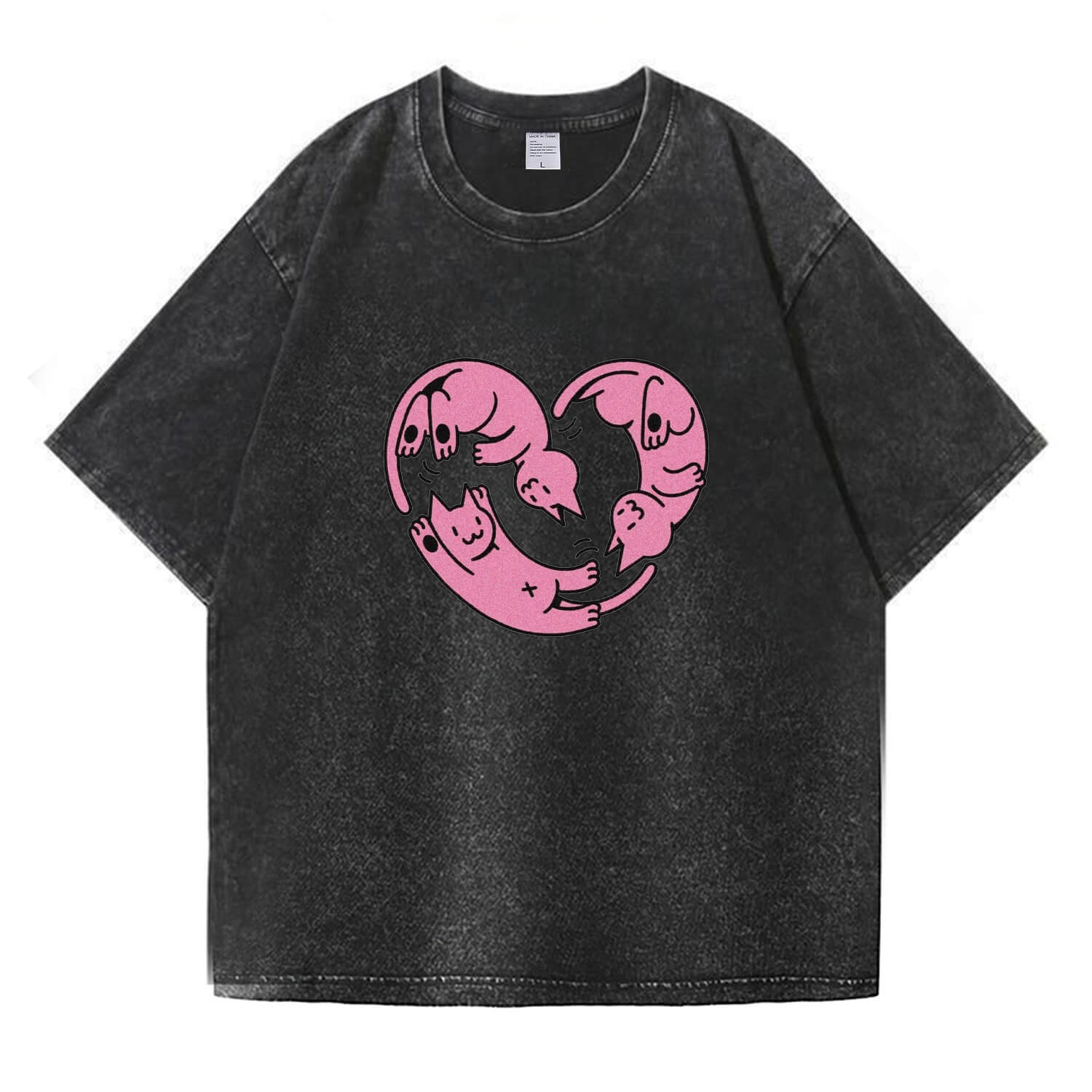 Add a touch of heartwarming charm to your wardrobe with this adorable "Love Heart Kittens" washed T-shirt. Featuring three cute kittens curled up in a heart shape, this T-shirt adds warmth and personality to your outfit – perfect for cat lovers and casual streetwear enthusiasts alike.