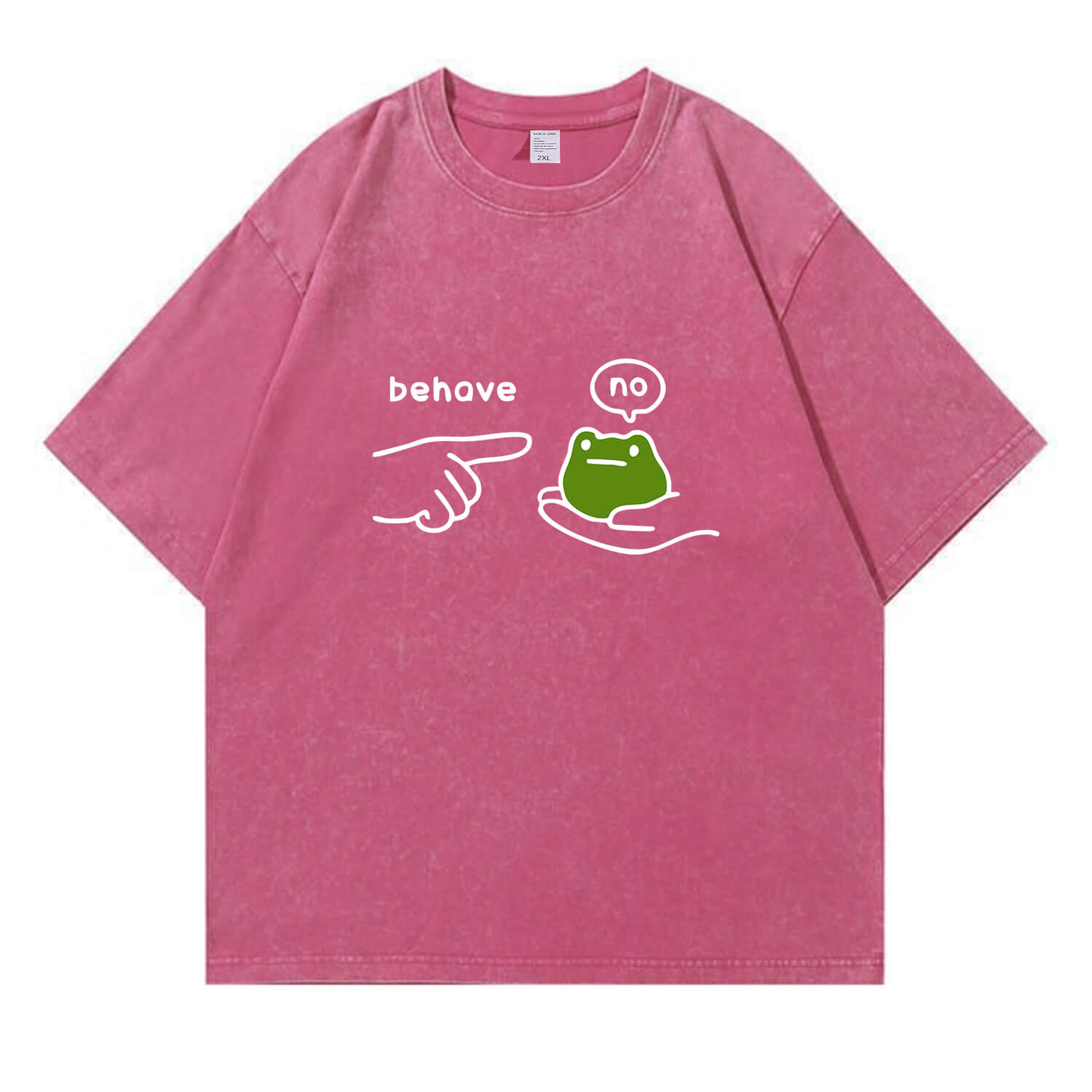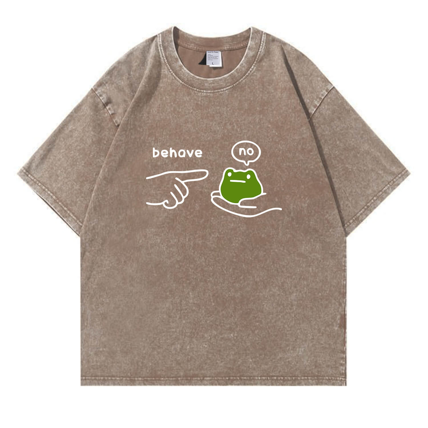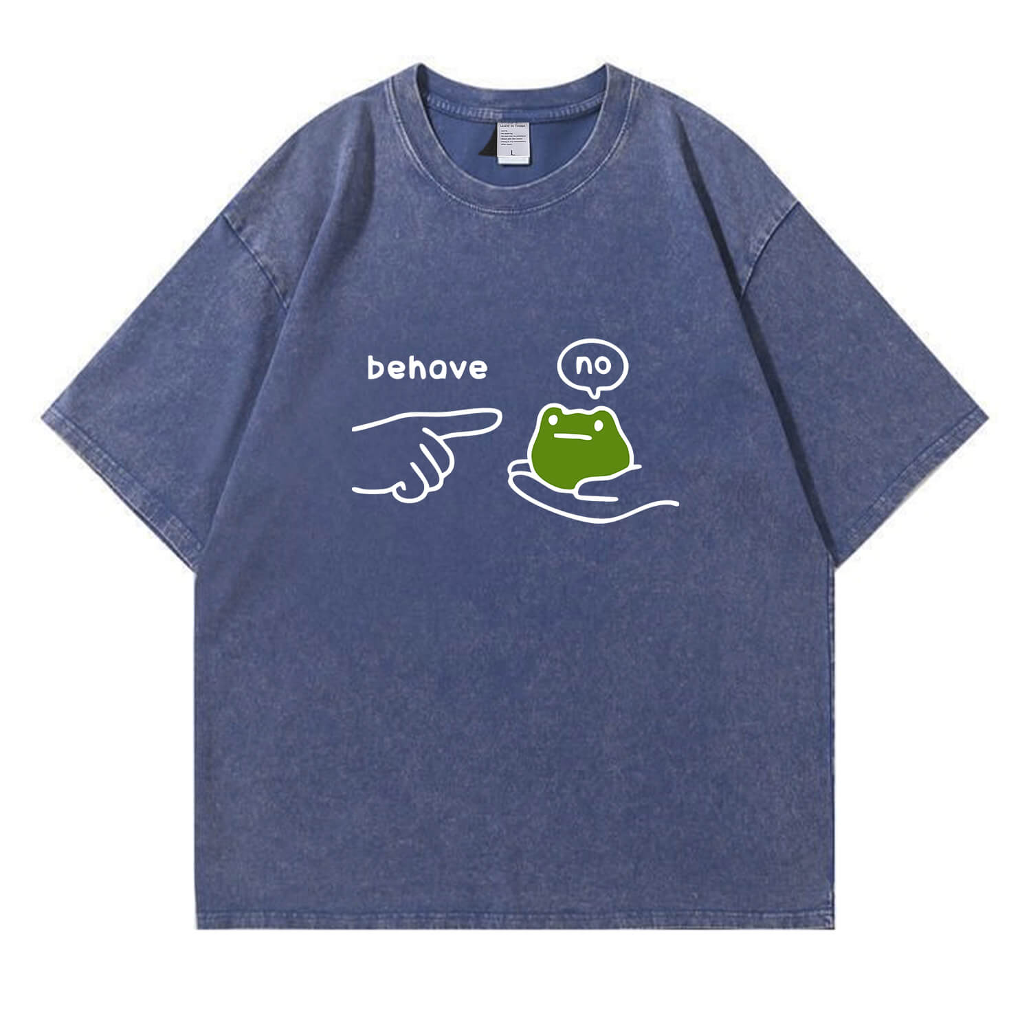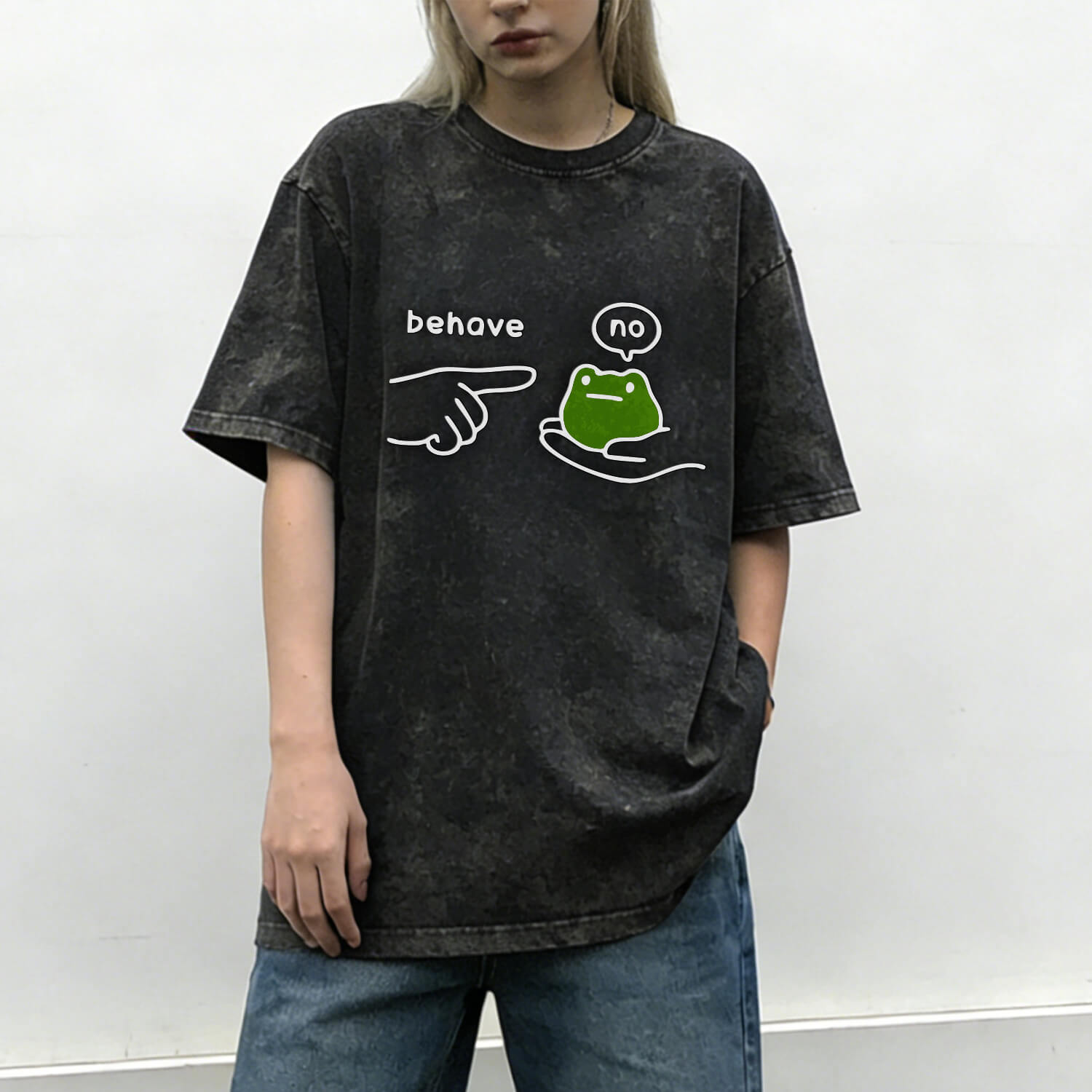 Show off your playful, rebellious side with our Behave No Frog Meme Graphic Vintage Washed T-Shirt—ideal for meme lovers and anyone who appreciates a silly, relatable “no” vibe.
