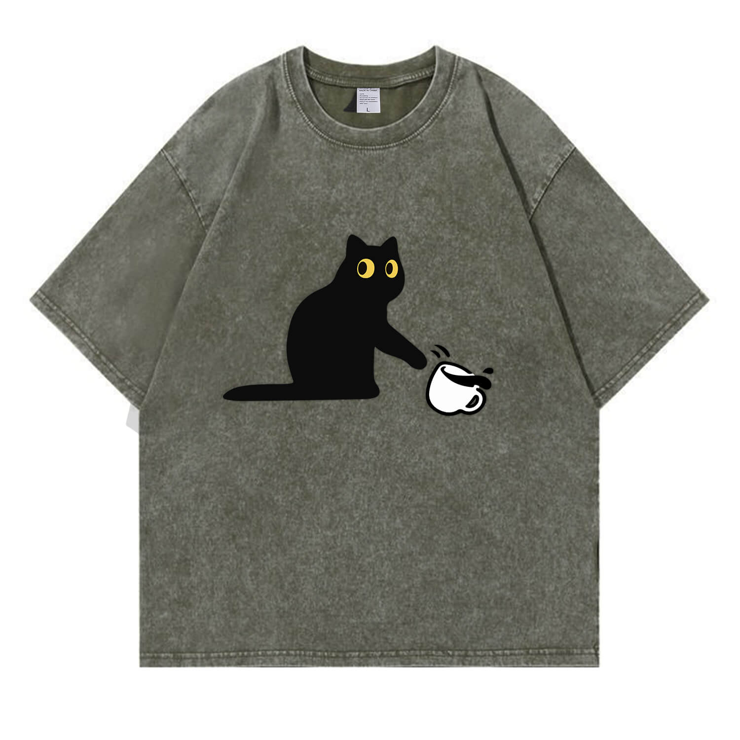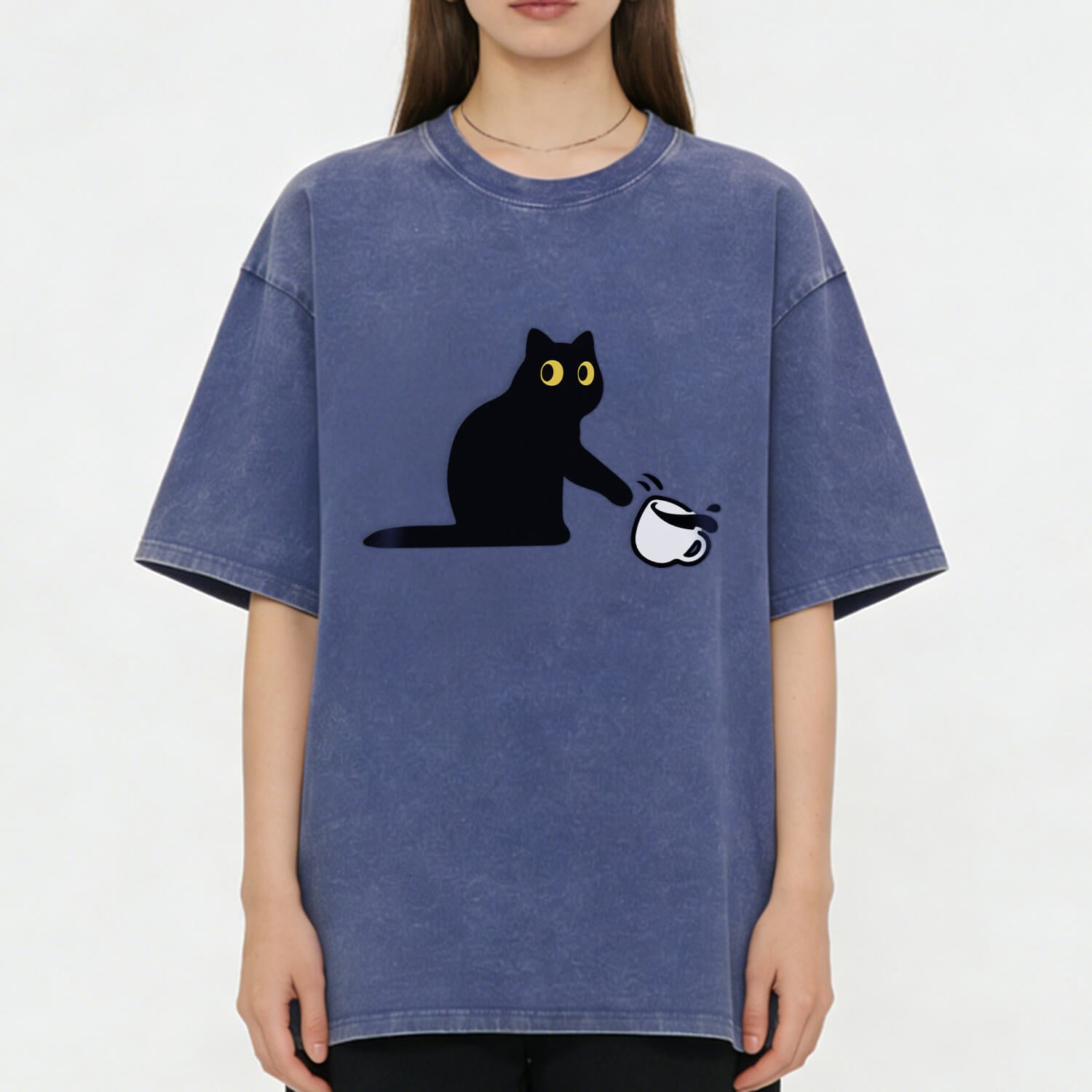 Add a playful twist to your everyday outfit with this Curious Cat Knocking Over Coffee Cup Washed T-Shirt. Featuring a funny and eye-catching black cat graphic, this tee perfectly captures that mischievous moment every cat lover can relate to.